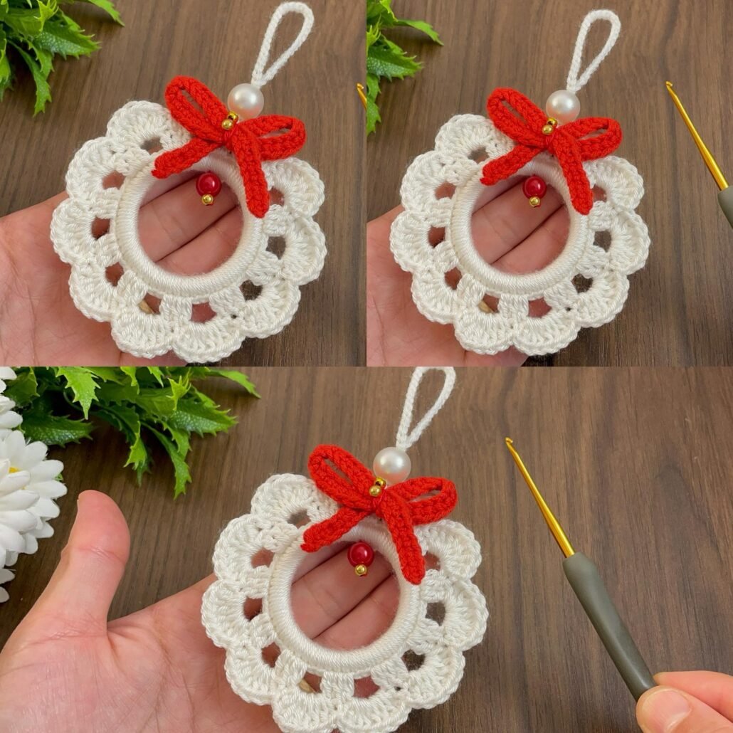 If you are looking for a festive and charming handmade decoration for the holidays, this Crochet Christmas Wreath Ornament Pattern-Step