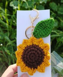 Once your sunflower and leaves are attached, connect the metal keychain ring. You can sew it directly to the back of the flower or use a small loop of yarn to attach it securely. Ensure that it’s fastened tightly so the keychain can handle daily use.