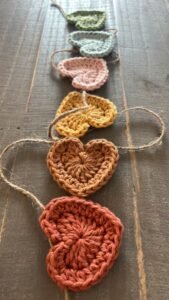 After completing the hearts, you will begin joining them. This can be done by crocheting a chain that connects each heart or by sewing them onto a string, depending on your preferred method.