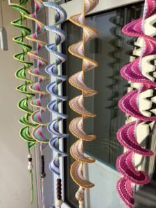 Another idea is to use it as a mobile indoors. Hanging from the ceiling, the spiral design captures light and creates movement when touched by air. It can bring a playful, whimsical touch to a child’s room or a craft corner.