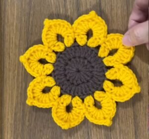 The most exciting part of this Simple Sunflower Crochet Coaster- Step by Step Tutorial is creating the bright and cheerful petals. Switch to yellow yarn for this step to bring the sunflower to life.
