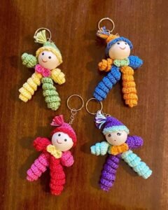 Attach the hat carefully, making sure it’s straight and well-positioned. Some crafters like to add small embellishments such as buttons, ribbons, or even glitter thread to give extra sparkle to their clowns. The wooden beads on the arms or body create a lovely contrast against the yarn and make the keychain stand out.