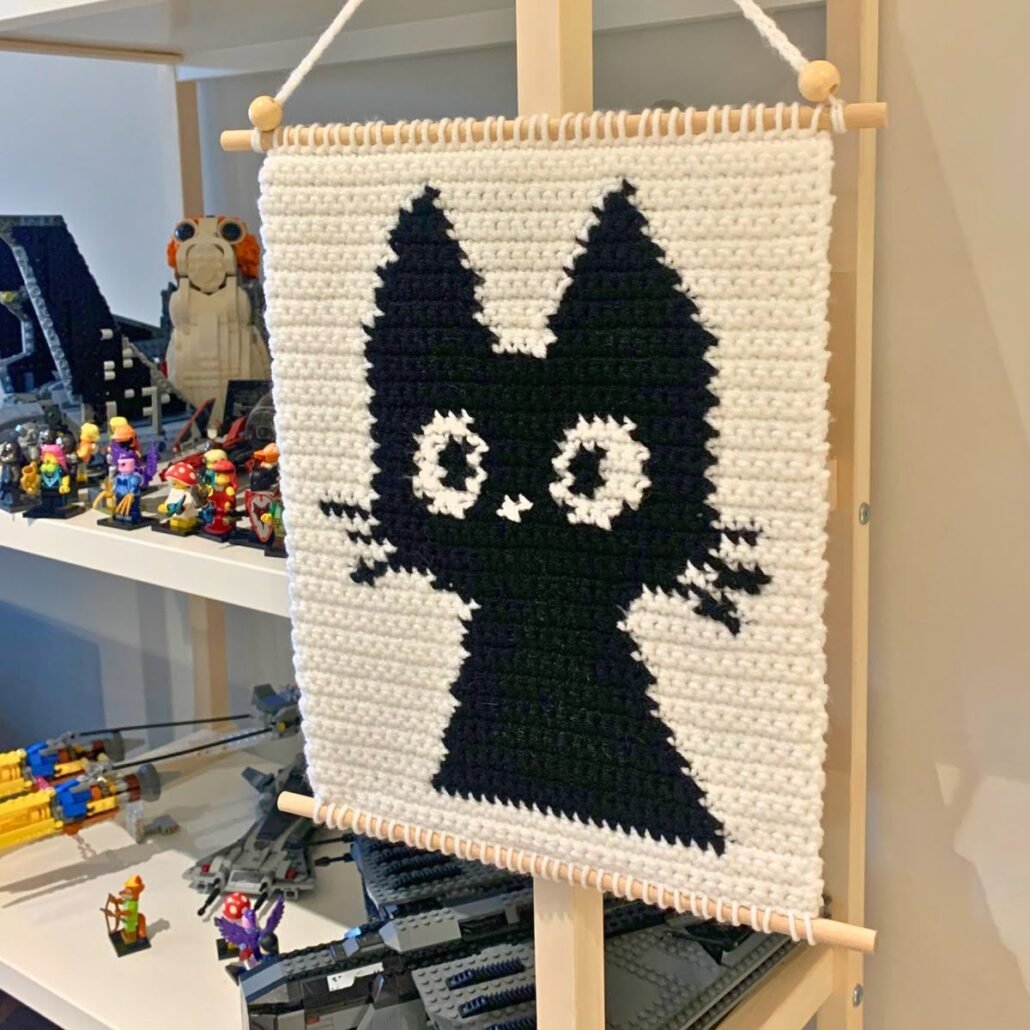 A crocheted tapestry with a pixelated design of a black cat. is a creative and modern crochet project that blends