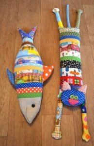 The structure of the template can vary. Some versions of the Door frame template made from leftover fabric are quilted, while others are simple layered designs.