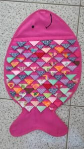 If you prefer a non-crochet version, you can make your fish-shaped rug using strips of old fabric and a latch hook canvas. This eco-friendly version is ideal for those who love upcycling and want to create something sustainable. Simply cut the fabric into strips and knot them through the canvas to build up your design.