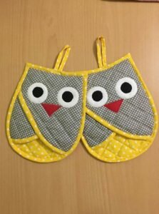 If you wish to make multiple gloves, prepare templates in different sizes or fabric combinations. Handmade kitchen accessories make wonderful gifts, especially during the holidays. The owl theme is universally appealing and adds charm to any kitchen.