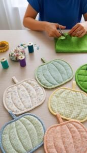 Consider making a set of pumpkin-shaped pot holders in different sizes or colors. A mix of orange, yellow, and green fabrics can represent a variety of pumpkins, adding a festive touch to your kitchen during the fall season.